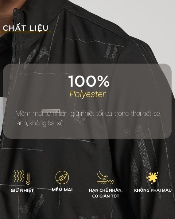 Áo khoác được làm từ 100% Polyester, mang lại khả năng chống nước và cản gió tối đa, giúp giữ ấm cơ thể hiệu quả trong mùa đông. Chất liệu này cũng mềm mại và siêu nhẹ, giúp giảm trọng lượng trang phục, giữ form tốt ngay cả khi vận động nhiều.