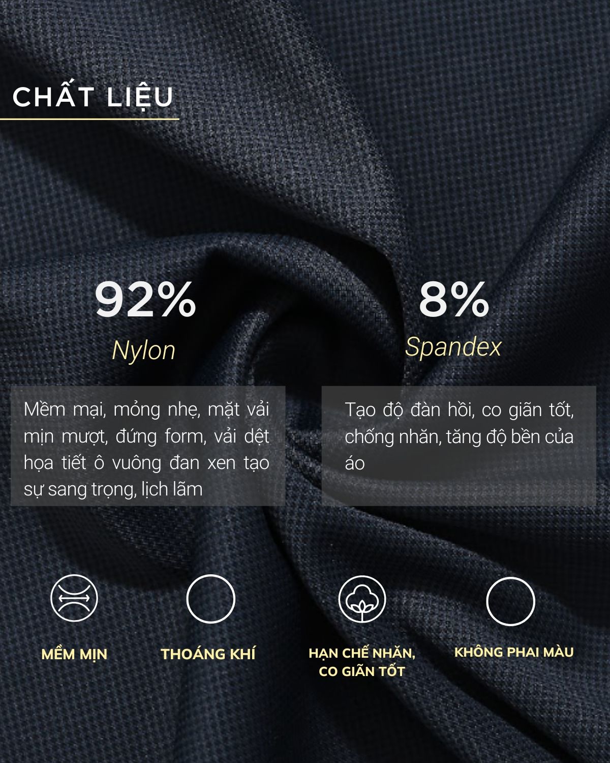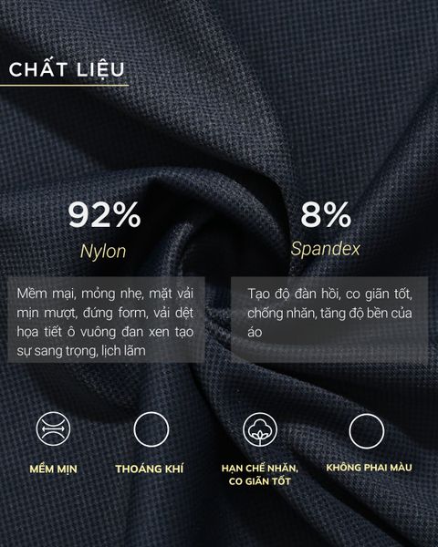 - Chất liệu: Vải dệt họa tiết với chất liệu 92% Nylon giúp bề mặt vải mịn mượt, mỏng nhẹ và vô cùng lịch lãm. Bề mặt vải sang trọng vượt trội chính là ưu điểm nổi bật nhất của loại vải này, kết hợp cùng 8% Spandex giúp áo tăng độ đàn hồi và độ bền.