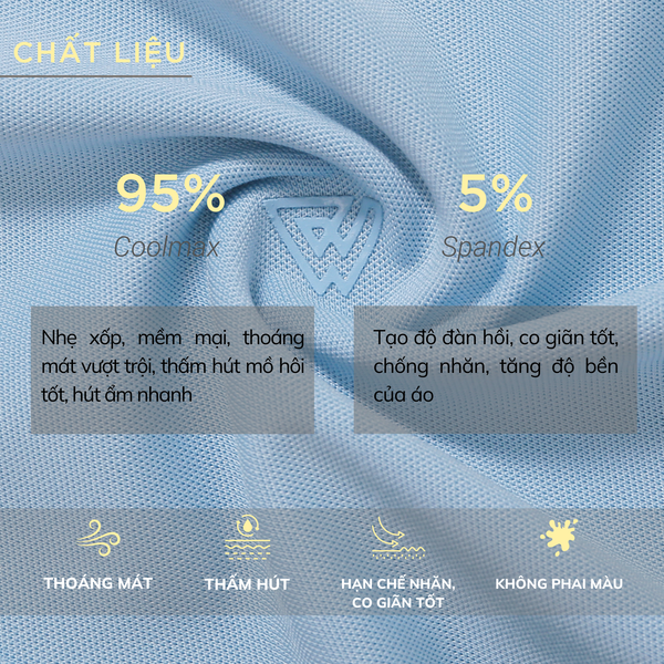 - Chất liệu: Áo có thành phần gồm 95% Coolmax với khả năng làm mát tối ưu, loại vải không thể thiếu giúp hạ nhiệt mùa hè. Áo polo đem lại cảm giác thoáng mát, mỏng nhẹ và dễ chịu. Cùng 5% Spandex giúp tạo form dáng tự nhiên và khả năng đàn hồi, co giãn nhẹ nhàng cho bề mặt vải. Tạo cảm giác thoải mái cho người mặc trong mọi hoạt động trong ngày.