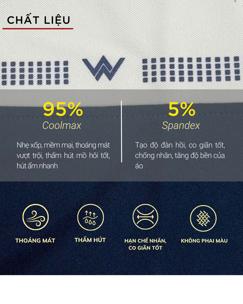 WPO180S được sản xuất từ 95% Coolmax và 5% Spandex, mang lại trải nghiệm tuyệt vời cho người mặc: