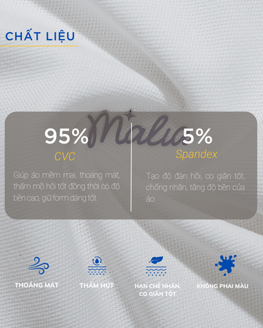 - Chất liệu: Vải dệt Single với chất liệu 95% CVC là sợi hỗn hợp của 2 thành phần sợi Polyester và sợi bông (cotton) giúp áo mềm mại, thoáng mát, thấm mồ hôi tốt đồng thời có độ bền cao, giữ form dáng tốt. Kết hợp cùng 5% Spandex tăng độ đàn hồi co giãn tạo sự thoải mái cho người mặc.