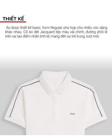- Chi tiết: Áo được thiết kế basic, form Regular không kén dáng, phù hợp cho nhiều vóc dáng khác nhau. Cổ áo dệt Jacquard tệp màu vải chính với thiết kế 3 cúc cài tạo độ mềm mại, thanh lịch. Đường phối lé trên vai tạo điểm nhấn tinh tế, mang đến sự trẻ trung, tươi mới. Áo polo ngày càng được phái nữ ưa chuộng vào mùa hè vì vừa mang đến vẻ lịch sự mà vẫn giữ được nét nhẹ nhàng, nữ tính.