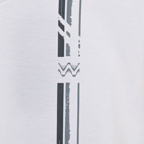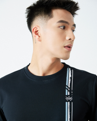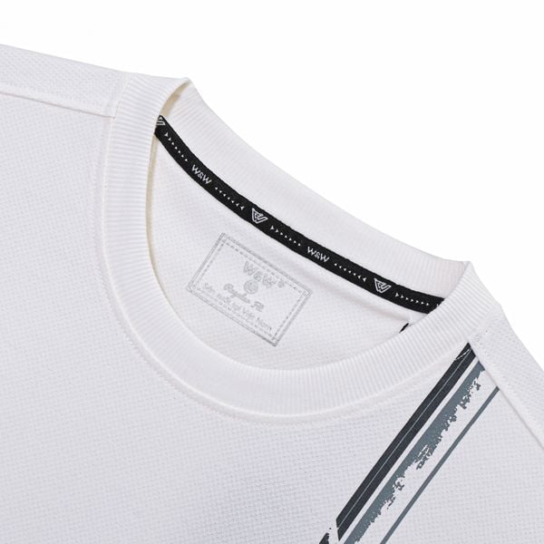 Áo có thiết kế cổ tròn và viền vai chồm, tạo cảm giác thoải mái khi vận động. Họa tiết in dọc trước ngực thể hiện phong cách trẻ trung. Thiết kế này không chỉ thời trang mà còn mang lại sự thoải mái hàng ngày.