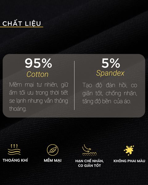 Chất liệu chủ yếu là 95% Cotton cao cấp tự nhiên, mang lại sự mềm mại, thoáng mát cho bề mặt vải, cùng với khả năng giữ form tốt và bền màu. 5% Spandex bổ sung tạo độ co giãn nhẹ, giúp áo ôm vừa vặn, thoải mái trong từng cử động.