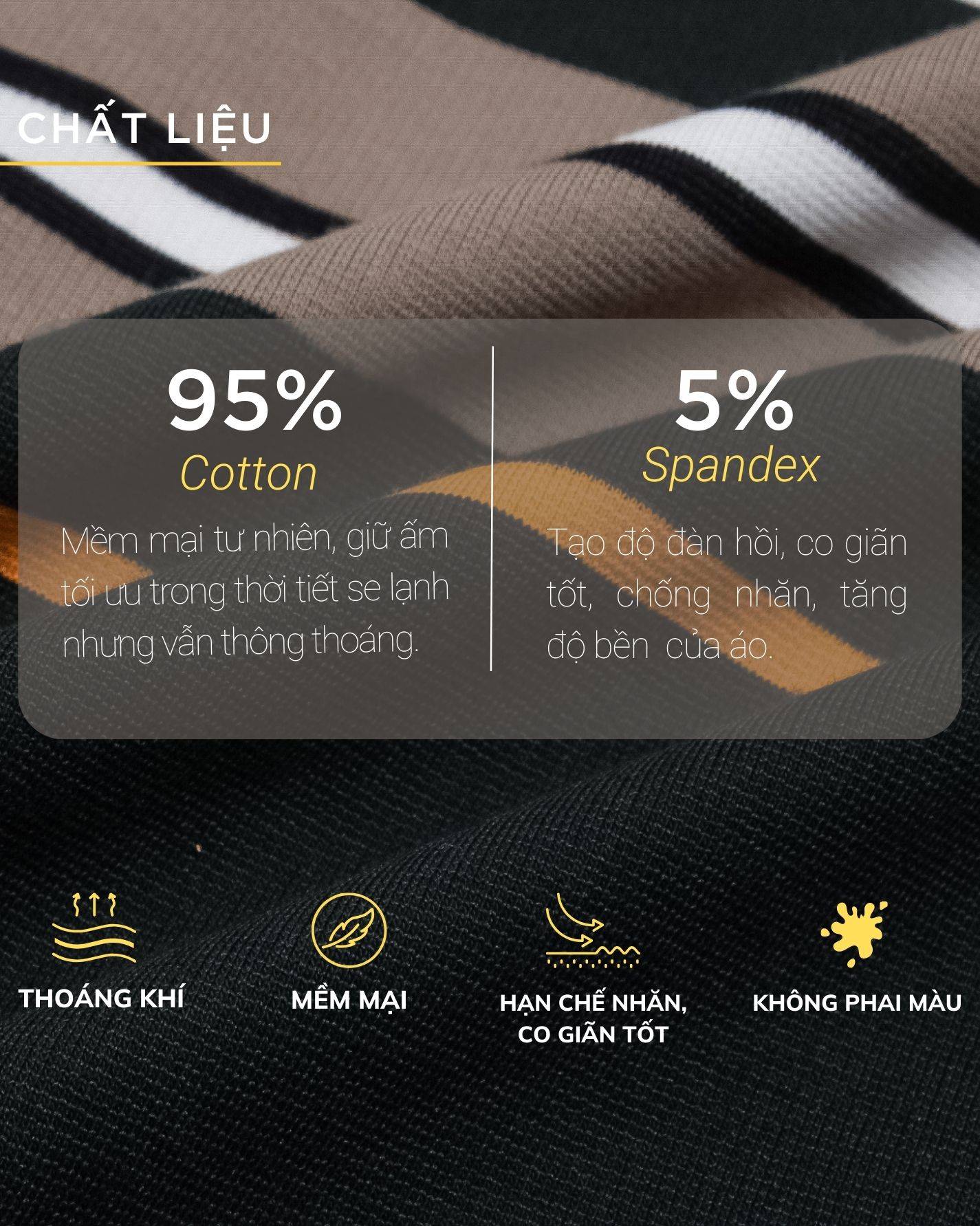 Chất liệu chính 95% Cotton cao cấp mang lại sự bền đẹp và mềm mại tự nhiên, giúp áo giữ ấm tối ưu trong thời tiết se lạnh nhưng vẫn thông thoáng. Sự kết hợp với 5% Spandex tạo độ co giãn nhẹ, giúp chống xù bề mặt, mang lại sự thoải mái tối đa cho người mặc.