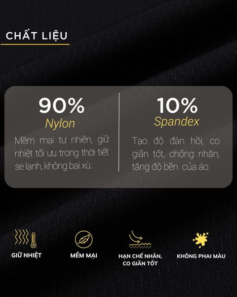Sự kết hợp giữa 90% Nylon và 10% Spandex tạo ra một chiếc áo polo nhẹ nhàng, mềm mại với khả năng giữ nhiệt tốt, đảm bảo cảm giác thoải mái cho người mặc trong thời tiết lạnh. Chất liệu này cũng giúp áo co giãn nhẹ, phù hợp với mọi cử động mà không gây cảm giác bí bách.