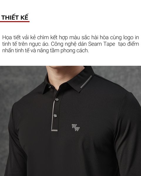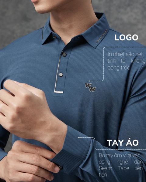 Áo polo dài tay W&W với thiết kế phom dáng hiện đại, sử dụng công nghệ dán Seam Tape tiên tiến ở các vị trí sườn, cổ tay và gấu áo, tạo điểm nhấn tinh tế và sang trọng. Họa tiết in kết hợp với logo in trên ngực áo thêm phần thanh lịch.